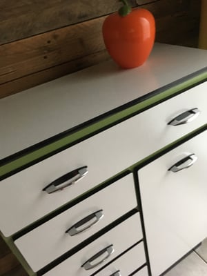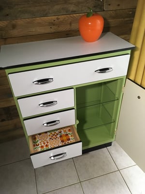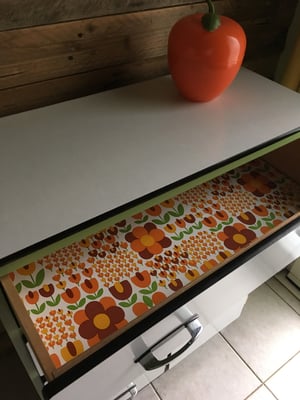 Et donc, grand nettoyage, ponçage, peinture... Enfin la totale... Ah oui et aussi le collage dans les tiroirs d'un vinyle auto-adhésif Alkor Walt Disney, un "vrai" vintage que j'ai déniché. (Si vous désirez aussi refaire un intérieur de meuble, les adhésifs peuvent donner un tout autre cachet en quelques minutes et c'est assez simple à placer, vous pouvez en trouver facilement ici)